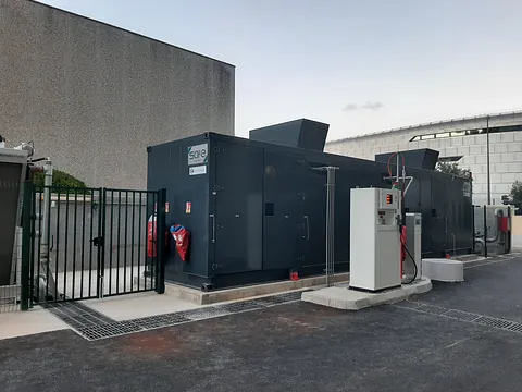 Le gaz comprimé à l’aide de 2 compresseurs de 200 kW sera stocké à 250 bar et distribué en remplissage nocturne au sein d’un parking aérien réparti sur 4 étages.